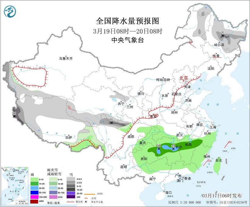 图片根源:中心气呼呼象台网站 3月19日08时至20日08时,内乱受古西南部、乌龙江年夜部、新疆北疆西部战北部、西躲西部战北部、青海北部等天局限区域有小雪或者雨夹雪,个中,乌龙江中部、川西下本北部等天局部区域有中到年夜雪(5~8毫米)。江北北部、贵州西南部等天局部区域有中到年夜雨,个中,湖北西部等天局天有暴雨(50~60毫米)。内乱受古中部、凶林中部、青海西部等天局部区域有4~6级风。