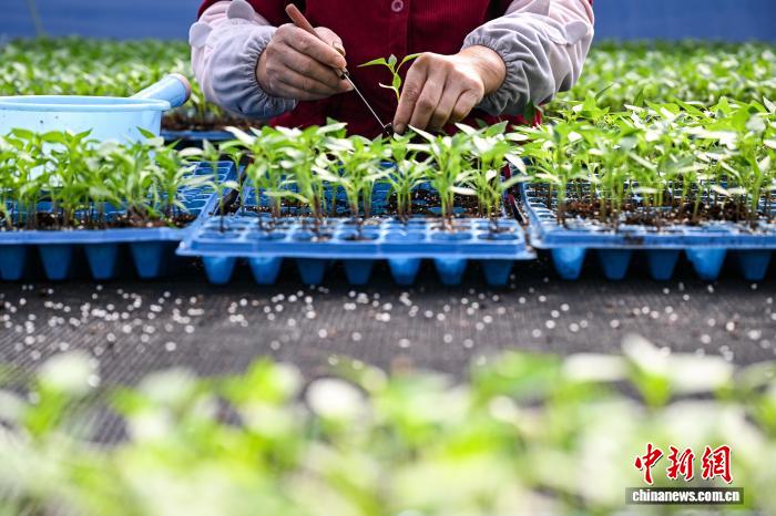3月10日,工人正在贵州省黔北州独山县麻万镇花圃村育苗基天移栽蔬菜苗。中新社记者 瞿宏伦 摄